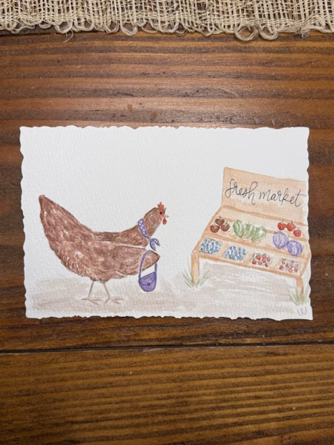 Here’s a little before-and-after of the setup and my light drawing beforehand. You can see a framed chicken that has amazing depth. I painted that over a year ago, and I love it. Such good depth and movement in the painting. I used it for inspiration. Nothing like being inspired by your own work. HA! You can also see that I didn’t plan to add a market, but by the time I finished painting the chicken, I felt the painting was incomplete. I was actually inspired by and thought of the book To Market, To Market, which goes “To market, to market, to buy a red hen, home again…” I like how this chicken has depth and texture. I am really trying to keep more white contrast in my watercolors, based on what I learned while painting the three chickens above, and I may need to add more once the painting is complete. So, although this chicken has more depth, I think keeping the white contrast will help in the future.