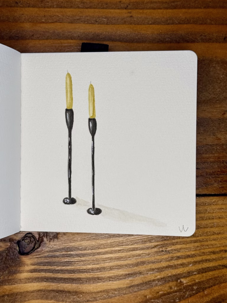 This week, I painted candles and ended up focusing only on the candlelight, which looked like a pepper. I told myself I would still share it because this is a process where I’m learning and growing. That mini watercolor took the longest. It pushed my skills, and I learned how important good watercolor paper is, and to be patient, or to use a blow dryer to speed up drying. The watercolor paper I have been using is thicker, and I also realized that, with all the layers needed, I didn’t let the paper dry between them. Making the paper overworked and pilled.